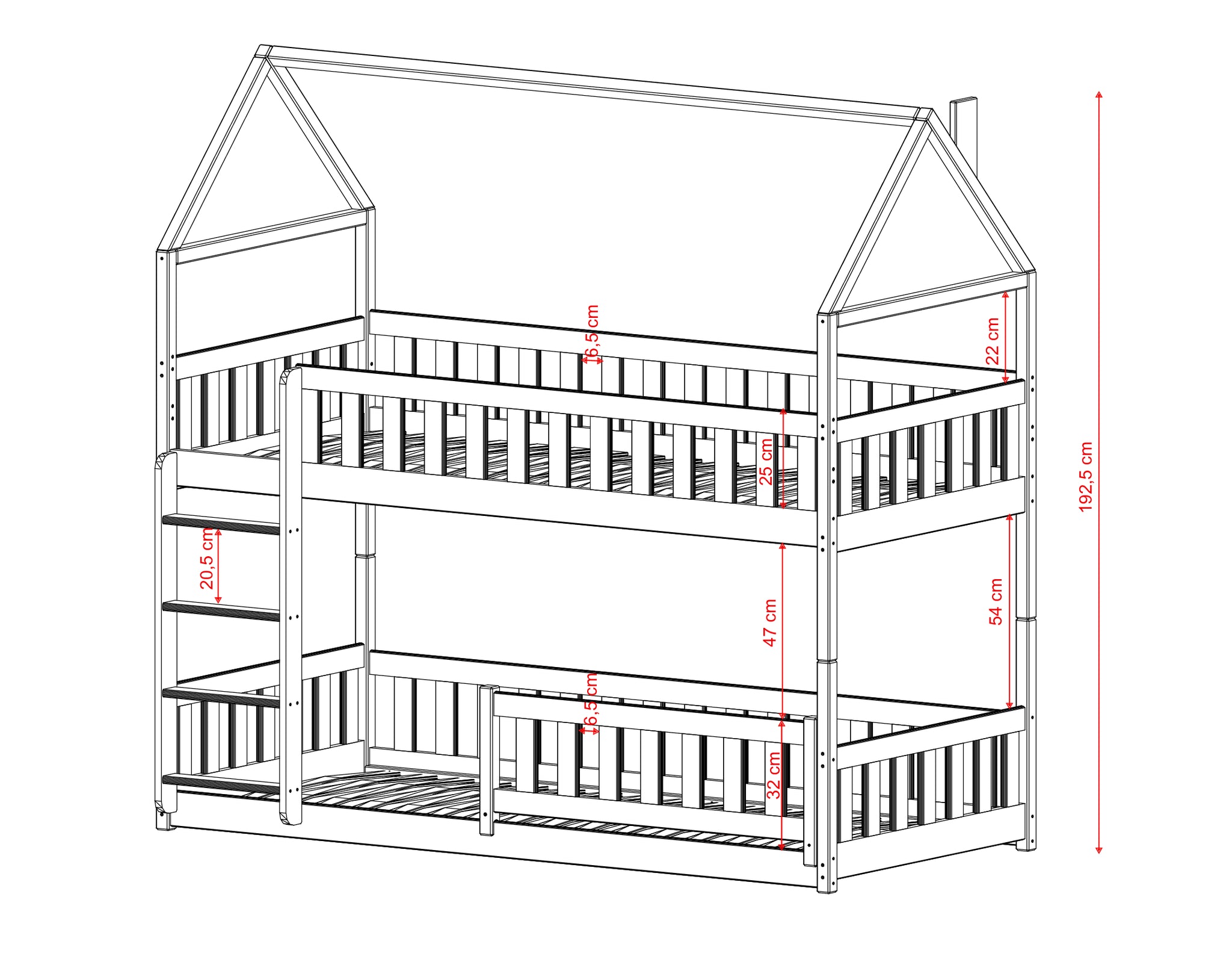Innifalið í kaupunum: Húskoju rúmgrind, stigi, færanlegt örryggishlið fyrir neðri koju,  festingarbúnaður og leiðbeiningar.
