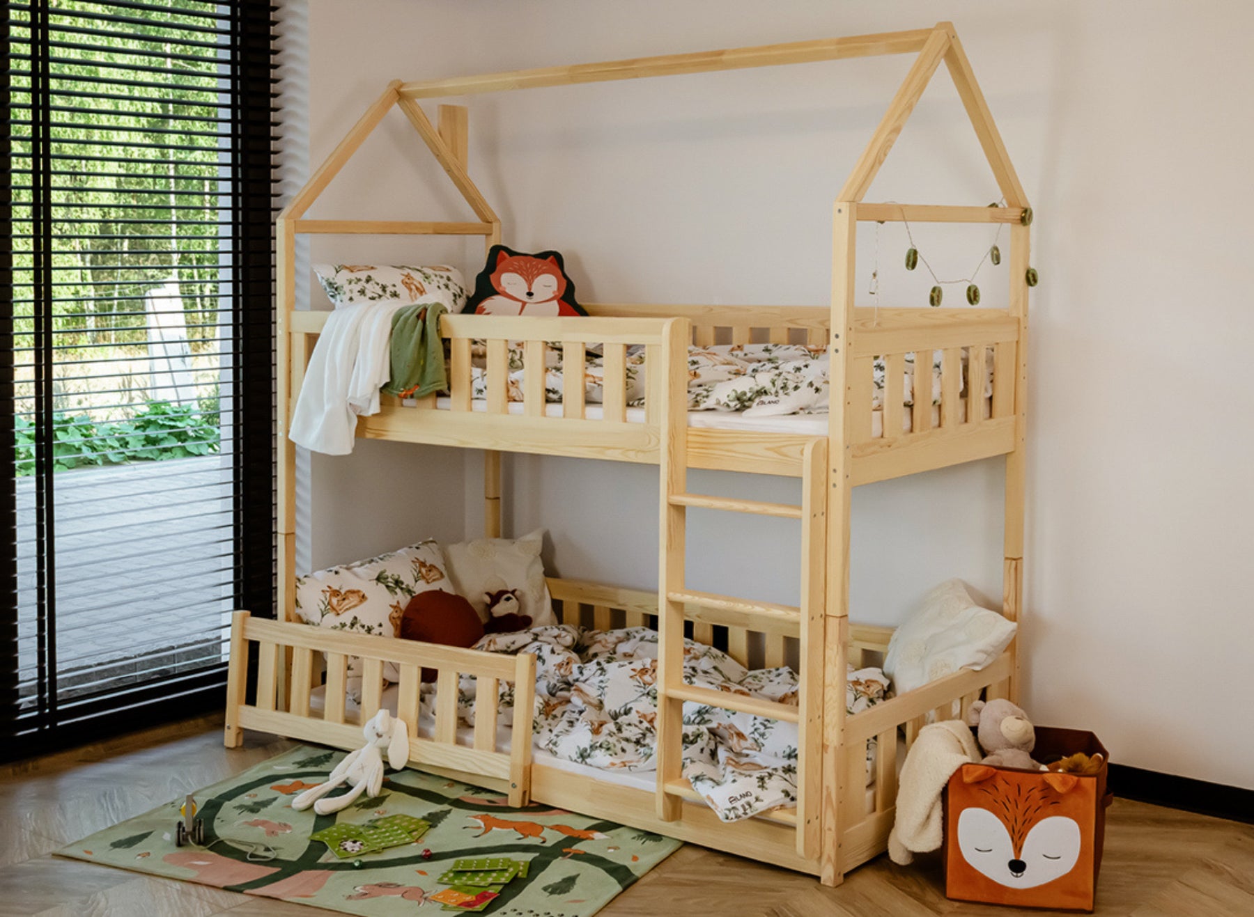 Barnarúmin okkar eru sérhönnuð með Montessori kennslufræðina í huga, svo börnin geti nýtt sér eigið sjálfstæði yfir háttatímann. Kojan hentar einstaklega vel systkinum á mismunandi aldri. Neðra rúmið er lágt og er með öruggum hliðum sem auðvelda litlum krílum að klifra sjálf upp í og úr, án þess að þurfa aðstoð. Kojan sjálf er alls ekki há eins og þær eiga oft til að vera, sem gerir hana mun öruggari en flest aðrar kojur á markaðnum. Viðurinn er náttúrulegur og endingargóður, sem skapar mjúkt og hlýlegt umhverfi í barnaherberginu.