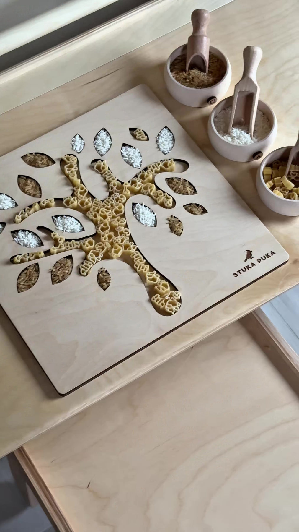 Púslborð fyrir skynræna vinnu og fínhreyfiþjálfun. Með púslinu fylgir þrjú viðarílát merkt með rúmfræðilegum táknum, og hefur verið komið hliðstæðum þeirra fyrir í einstökum hólfum púslsins. Þrjú mismunandi áhöld fylgja með en þau auka möguleikana á leik með ýmsum hætti til að ausa og hella. Barnið þitt getur búið til mynstur samkvæmt „kóðanum“ eða unnið frjálst með einstök hólf. Allir hlutar púslsins eru hreyfanlegir; þú getur bætt við, fjarlægt og skipt rýmum púslsins til að búa til þínar eigin útgáfur af myndum. Endilega litaðu og skreyttu einstaka hluti og prófaðu formið með því að fylla það af grjónum, baunum, pasta eða litlum náttúrugersemum sem fundist geta á gönguferð. Mundu að það eru svo margar mismunandi lausnir!