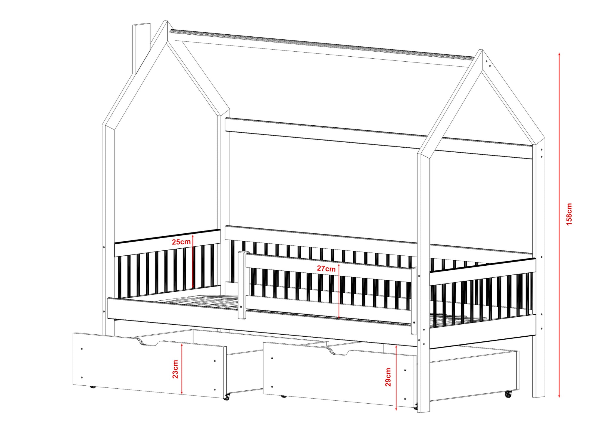 Innifalið í kaupunum: Rúmgrindin með húsi, 2 skúffum, festingarbúnaður og leiðbeiningar.