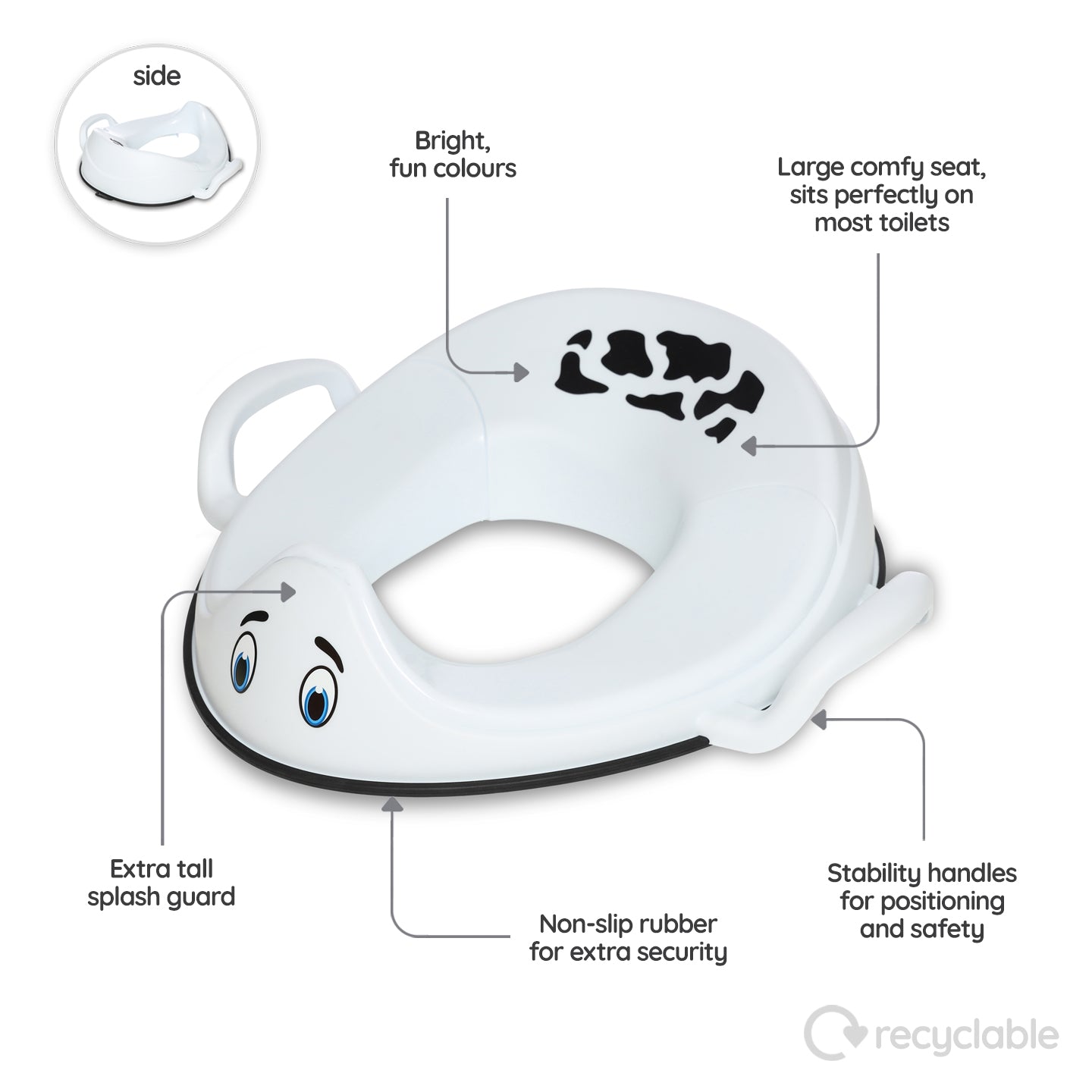 Setan auðveldar skrefið frá koppnum yfir á klósettið með þægilegri, líkamsmótaðri hönnun, öruggum handföngum og hárri slettivörn sem gerir klósettferðir bæði þægilegar og öruggar. Þetta eykur sjálfstraust og sjálfstæði barnsins. 🎉