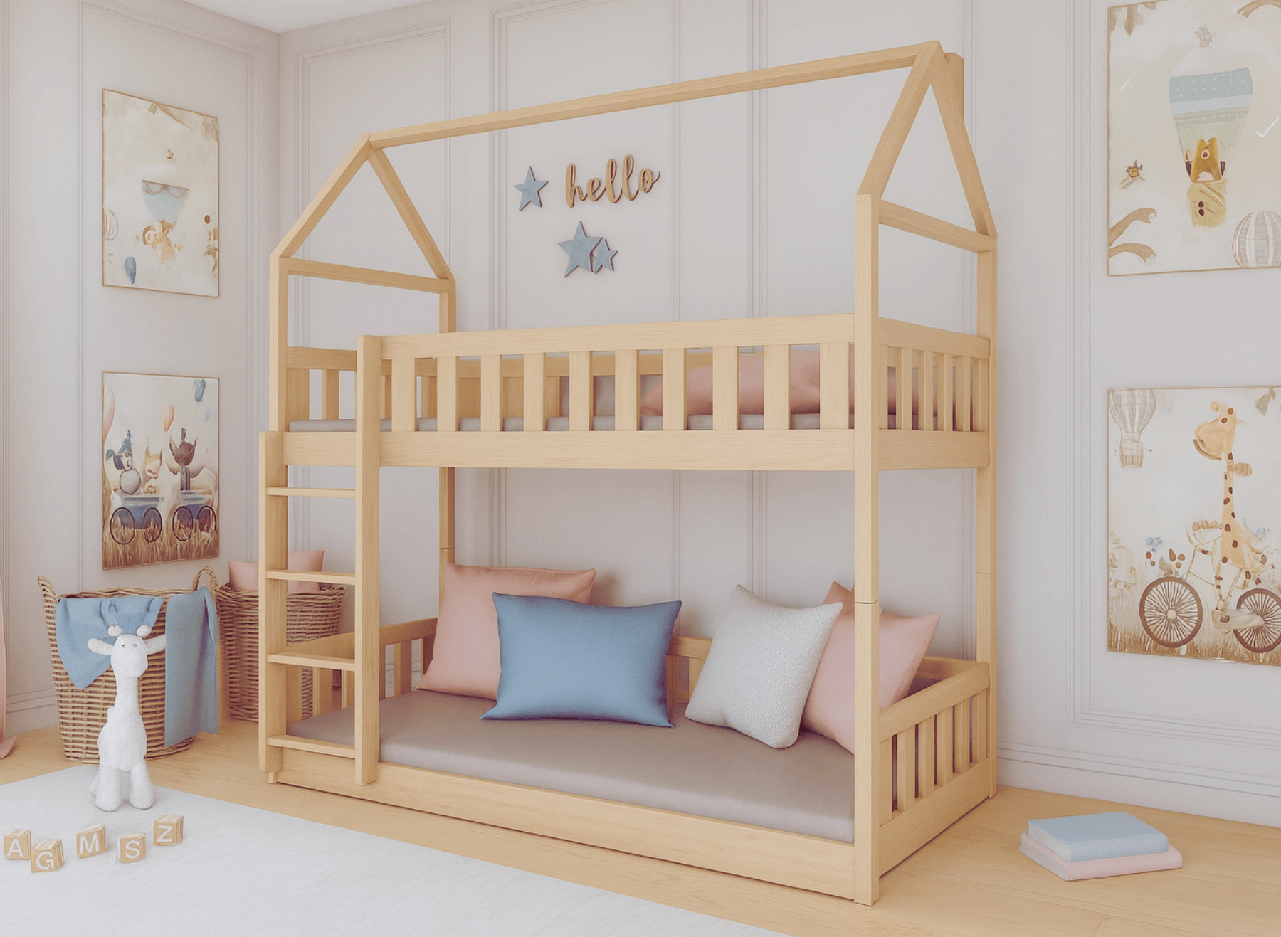 Barnarúmin okkar eru sérhönnuð með Montessori kennslufræðina í huga, svo börnin geti nýtt sér eigið sjálfstæði yfir háttatímann. Kojan hentar einstaklega vel systkinum á mismunandi aldri. Neðra rúmið er lágt og er með öruggum hliðum sem auðvelda litlum krílum að klifra sjálf upp í og úr, án þess að þurfa aðstoð. Kojan sjálf er alls ekki há eins og þær eiga oft til að vera, sem gerir hana mun öruggari en flest aðrar kojur á markaðnum. Viðurinn er náttúrulegur og endingargóður, sem skapar mjúkt og hlýlegt umhverfi í barnaherberginu.