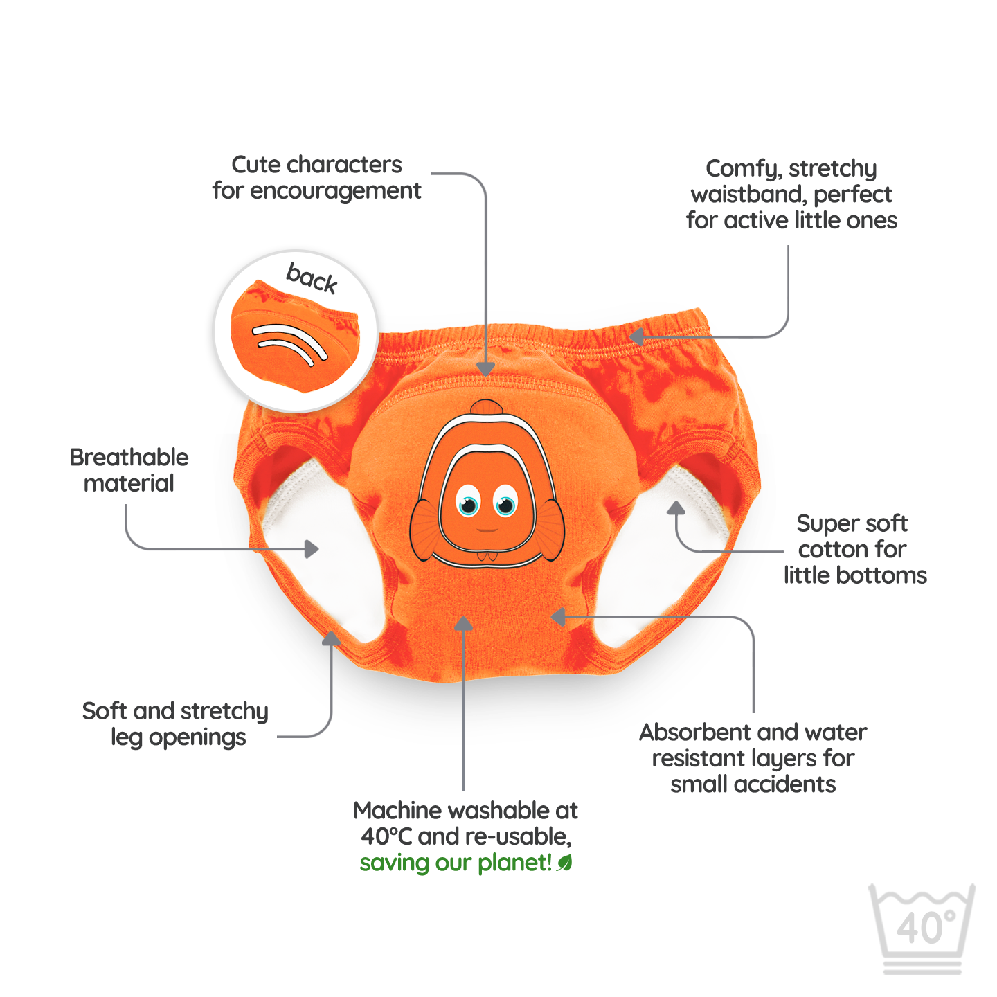 • Sparnaður: Endurnýtanleg hönnun sem sparar peninginn sem færi annars í einnota bleyjur.