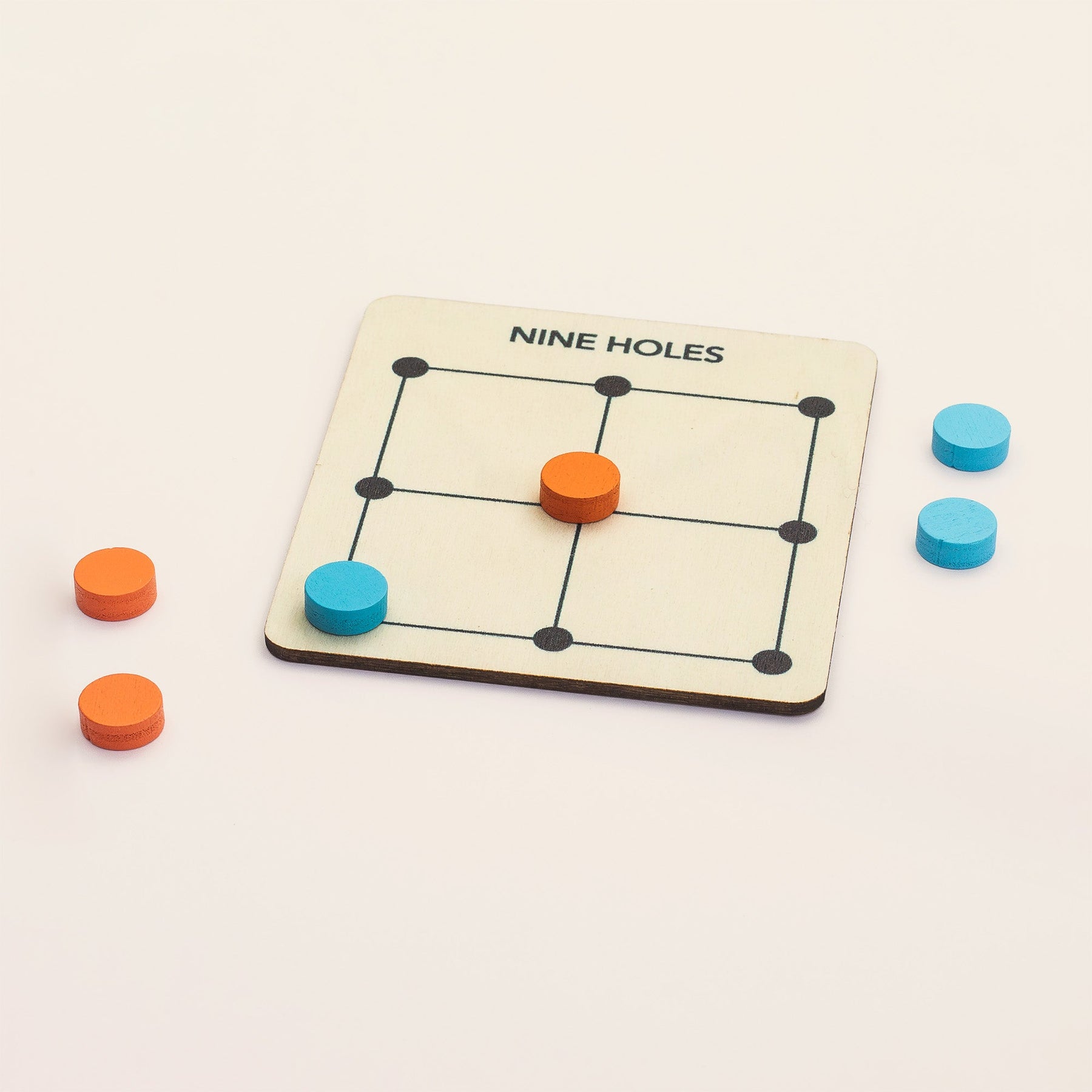Látið ekki einfalda útlitið blekkja ykkur, Game of Nine Holes er hraðvirkt og úthugsað klassískt spil þar sem markmiðið er að yfirvinna andstæðinginn með aðeins þremur peðum hvor.