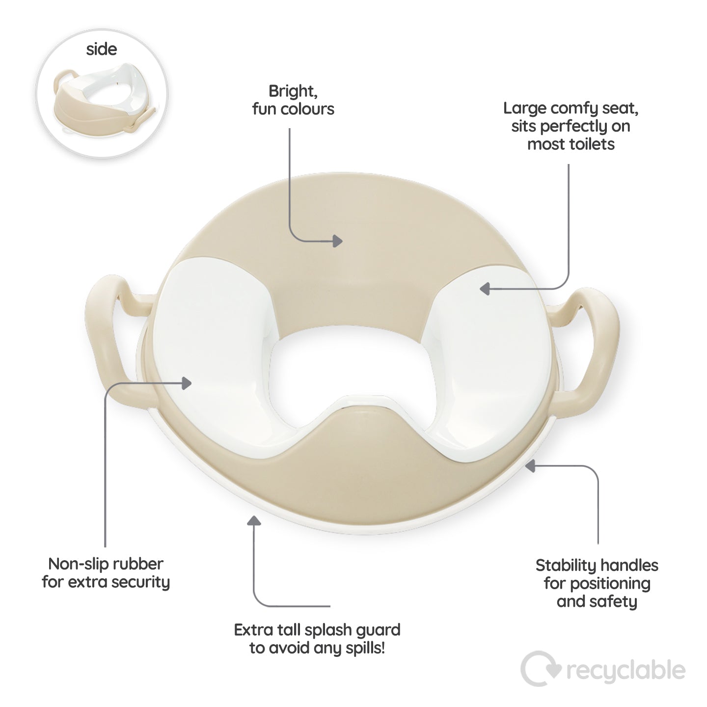 Setan auðveldar skrefið frá koppnum yfir á klósettið með þægilegri, líkamsmótaðri hönnun, öruggum handföngum og hárri slettivörn sem gerir klósettferðir bæði þægilegar og öruggar. Þetta eykur sjálfstraust og sjálfstæði barnsins. 🎉